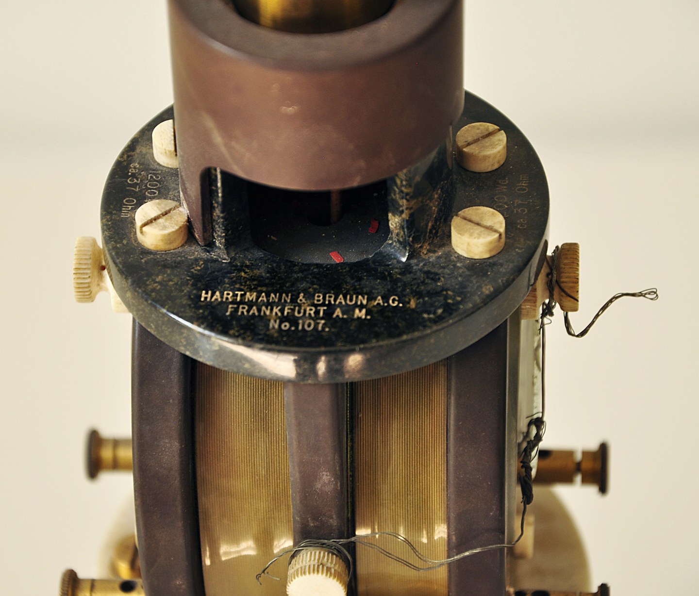 L’elettrodinamometro è uno strumento che serve a misurare l’intensità di una corrente. In questa versione la corrente da misurare passa fra due bobine fisse poste in posizione verticale al centro dello strumento. La corrente genera un campo magnetico che fa ruotare una bobina mobile appesa ad un filo e posta all’interno delle altre due bobine fisse. Sulla bobina mobile è appoggiato uno specchietto sul quale viene riflesso un raggio di luce che viene inviato su una scala graduata: quando la bobina ruota, lo spostamento del punto luminoso sula scala graduata (seno dell’angolo) è proporzionale al quadrato della corrente.